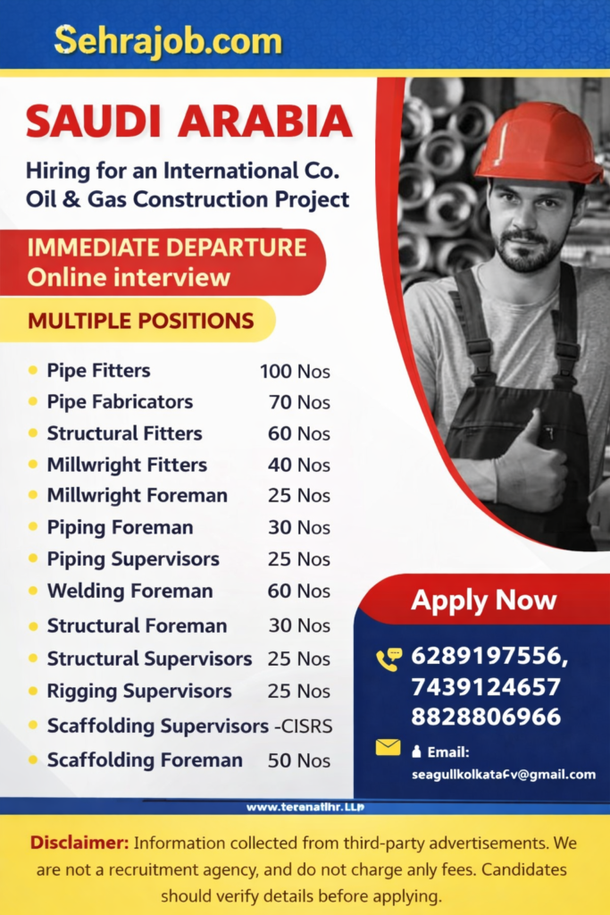 These Saudi Arabia Oil and Gas Jobs are open for experienced candidates who want to work in Gulf countries. Saudi Arabia Oil and Gas Jobs 2026 के लिए international oil & gas construction project में skilled candidates की भर्ती की जा रही है। Selection online interview के माध्यम से किया जाएगा.